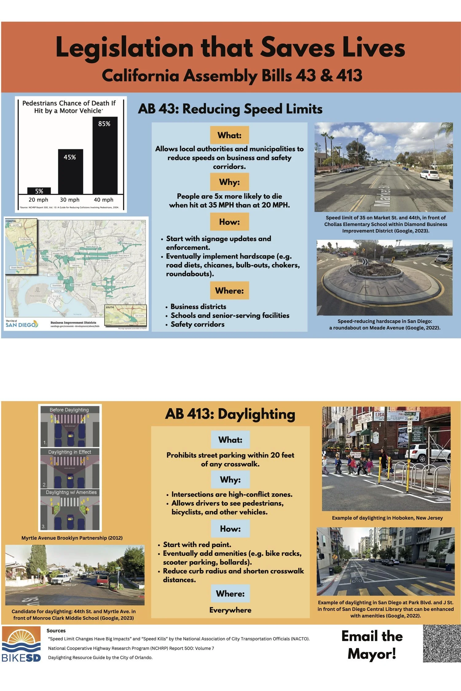 About two years ago, we kicked off our Legislation that Saves Lives campaign, calling on the City of San Diego to immediately implement two important state laws: AB43 (lowering speed limits in key pedestrian and safety zones) and AB413 (daylighting intersections to improve visibility and prevent crashes). We proudly launched this campaign at the 2024 CalBike Summit right here in San Diego.